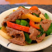 牛肉片、彩椒、葱、姜、蒜、洋葱头、料酒、生抽、生粉、胡椒粉、鸡粉、糖。