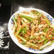 背脊肉、蒜薹、生姜、油、盐、生抽、淀粉、味精、豆瓣。