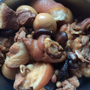 猪蹄、花生、香菇、鸡蛋、八角、桂皮、花椒、辣椒、枸杞、生抽、老抽、料酒、冰糖、盐、姜。