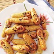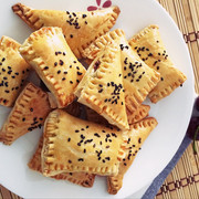 面粉、黄油、植物油、面粉、黄油、清水、蛋黄、红豆沙、蛋液、黑芝麻。