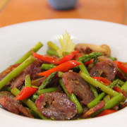香肠、芦笋、红椒、盐、植物油、洋葱、大葱、大蒜。