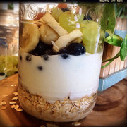 燕麦片、原味酸奶、蓝莓、香蕉、大杏仁、焦糖酱。