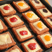 巧克力吐司面包、奶酪、炼奶、巧克力酱、蜂蜜咖椰酱、草莓酱。