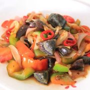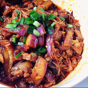 手撕肉、茄子、、大葱、洋葱、李锦记蒸鱼油、大蒜。