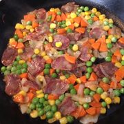 香肠、大米、豌豆、玉米、胡萝卜、洋葱、橄榄油、盐、酱油。
