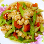 鲜虾、西芹、红甜椒、姜、大蒜、豆粉、盐、生鲜抽、白糖、胡椒粉、芝麻油、食用油。