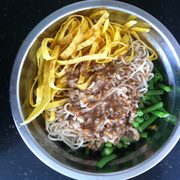 面条、鸡蛋、豆角、大蒜、花生碎、芝麻酱、醋、盐、麻油、辣椒碎。