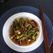 鲜面条、猪前腿肉、长豆角、黄豆芽、葱、姜、蒜、八角、调味料。