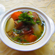 极乐牛鞭、鸡肉、人参、胡萝卜、白萝卜、香菜、枸杞、姜、葱段、桂皮、香叶。