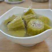苦瓜、瘦肉、香菇、蒜、盐、油、味精。
