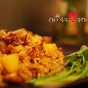 米饭、土豆、大肉、香肠、大葱、大蒜、生姜、生抽、老抽、盐。