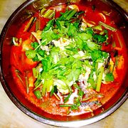 草鱼、千张、芹菜、黄豆芽、金针菇、香菜、火锅底料、蒜、姜、葱、盐、糖、鸡精。