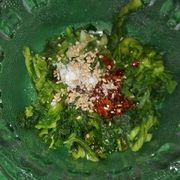 橄榄菜、芝麻、盐、酱油、味精、陈醋、白糖、香油、辣椒油。