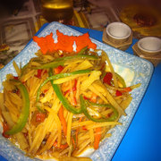 土豆、青椒、胡萝卜、生抽、白糖、山西陈醋、花椒、剁椒、麻油。