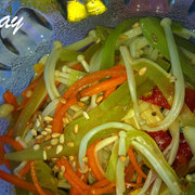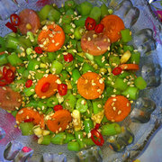 豇豆、胡萝卜、火腿肠、大蒜、盐、糖、生抽、美人椒、醋、熟芝麻、麻油。