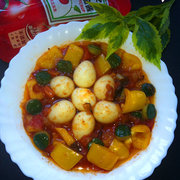 西红柿、鹌鹑蛋、黄色彩椒、黄瓜、大蒜、盐、糖、番茄沙司、鸡精、玉米油。