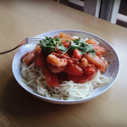 番茄、虾仁、面条、芫须、盐、糖、味精。