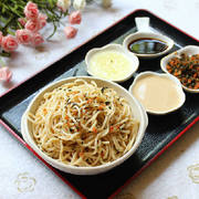 鲜面条、黄瓜、绿豆芽、蒜泥、花生芝麻酱、胡萝卜、香醋、香椿、咸菜。