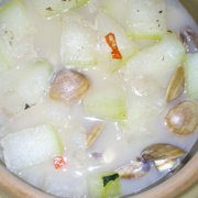 冬瓜、花蛤、摇柱、虾米、姜片、蒜头、白胡椒粉、白酒、鱼露、鸡粉、盐油、水。