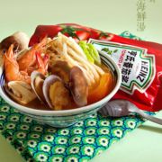 虾、花蛤、草菇、金针菇、生菜、番茄、亨氏番茄酱、盐、油、芹菜。
