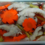 鸡爪、花椒、八角、桂皮、香叶、姜片、蒜、葱结、泡椒、白醋、盐、白糖、料酒。