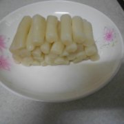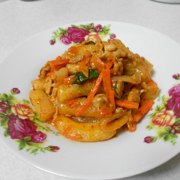 年糕、五花肉、红萝卜、洋葱、蒜苗、泡菜、盐、韩国辣椒粉、酱油、鸡精。