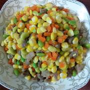 青豆、甜玉米、胡萝卜、猪肉粒、蒜蓉、鸡粉、盐、酱油、胡椒粉、花生油、生粉。
