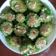 五花肉、凉瓜、葱花、盐、鸡粉、生抽、胡椒粉、生粉、蒜蓉。