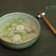 尖米丸、秋瓜、猪肉饼、猪肉丸、猪肉、骨汤、冬菜、蒜头朥、盐。