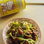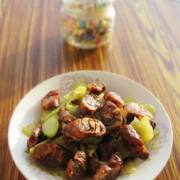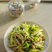 蒜苗、鸡肉、盐、料酒、酱油、鸡精。