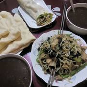 绿豆芽、五花肉、黑木耳、青椒、料酒、盐、生抽、十三香、醋、味精、鸡精、香油。
