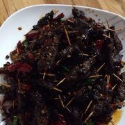 牛肉、牙签、盐、酱油、花椒、干辣椒、鸡精。