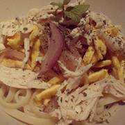 意大利面、鸡胸肉、鸡蛋、洋葱、蒜泥、盐、生抽、罗勒碎、胡椒、料酒。