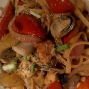 意大利面、鸡胸肉、洋葱、草菇、大葱、红椒、料酒、五香粉、罗勒、鱼露、盐、生抽 老抽。