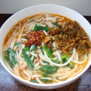 米线、韭菜、豌豆尖、肉末、香辣酱、酸腌菜、盐。