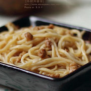 面条、猪肉、干冬菇、肉蒜、葱、姜、酱油、砂糖、豆瓣酱。