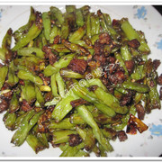 豆角、肉丁、盐、酱油、料酒、葱、姜、糖、干红辣椒。