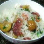 板栗、腊肠、猪肉、虾米、白米、青蒜。