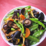 荷兰豆、木耳、金针菜、香菇、胡萝卜、味精、盐。