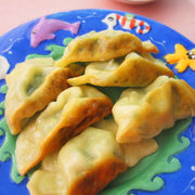 饺子皮、韭菜苔、凉薯、虾、五花肉、麻油、白胡椒粉、味精、盐。