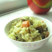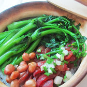 泰国香米、腊肠、油菜、脆花生米、番薯、葱花。