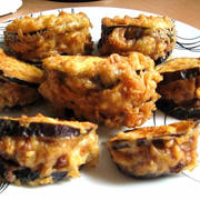 圆茄子、牛肉糜、糖、鸡蛋、泡打粉、料酒、生抽、胡椒粉、葱花、盐、面糊、面粉、淀粉、味精。
