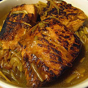 三文鱼、咸蹄髈肉、洋葱、豆芽、笋片、老抽、黄酒、黑胡椒粉、糖、盐、淀粉。