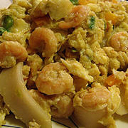 年糕、葱、虾仁、鸡蛋、青豆、橙色园椒。