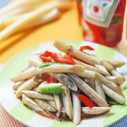 藕带、青红椒、蒜末、盐、鸡精、番茄酱、水淀粉、油。