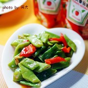 四季豆、红菜椒、蒜末、盐、鸡精、番茄酱、油。
