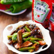 长茄子、豇豆、青椒、蒜末、油、盐、鸡精、番茄酱、水淀粉。