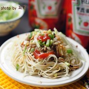 鲜面条、黄瓜、花生碎、葱花、盐、油、醋、番茄酱、芝麻酱、豆豉酱、酱油。