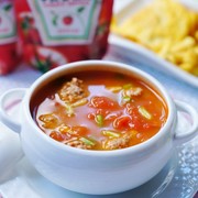 番茄、猪肉糜、葱花、蒜末、油、盐、鸡精、料酒、淀粉、番茄酱。