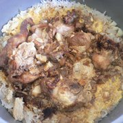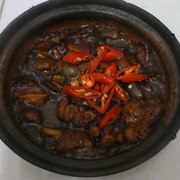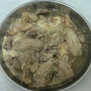 鸡块、米、水、蛋、葱片、蒜米、姜碎、咸鱼、盐、麻油、酱油。
